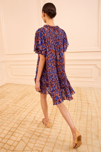 At once playful and effortless, the Ryla Dress flows in crinkled chiffon with soft botanicals that are inspired by pointillism artwork. This airy, multicolored dress moves with volume, crafted with gathers and pleated tiers throughout the silhouette. - Crinkled silk chiffon - Model Height: 5'11" - Designed for an oversized fit - Mini length - Round neckline - Flutter short sleeves - Removable slip - Button keyhole at back - Composition: 100% silk - Dry clean only - Style# SP260114