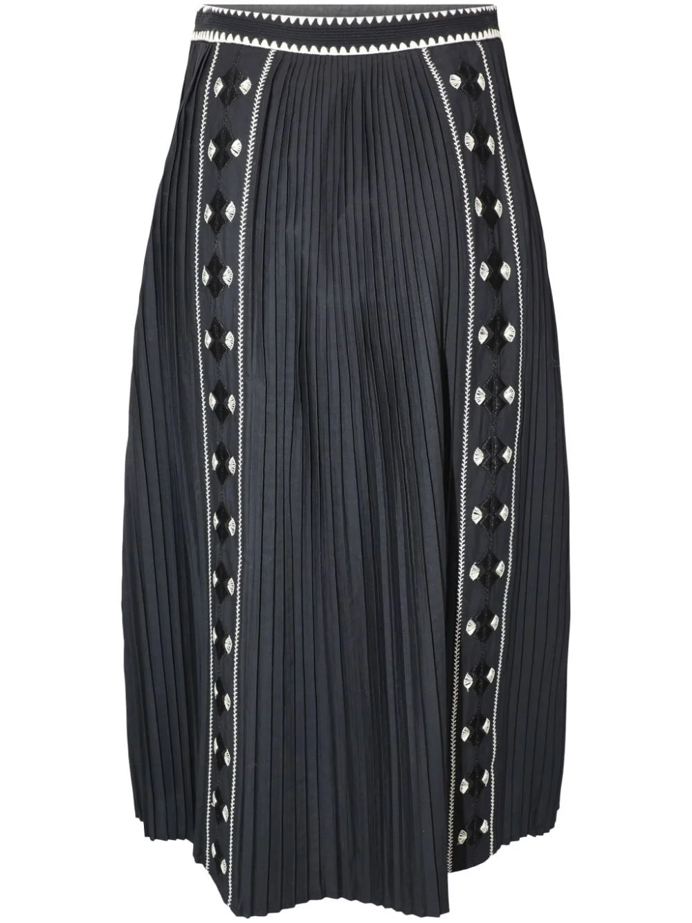 Sabina pleated embroidered midi skirt Highlights - Black - Cotton - Embroidered design - Fully pleated - High-waisted - Concealed side hook and zip fastening - Calf-length - Straight hem Imported Composition Cotton 100% SIZE & FIT FittingInformation This midi-length skirt is intended to be worn just below the waist Made from a midweight non-stretch fabric Washing instructions Read Manufacturer Guidelines