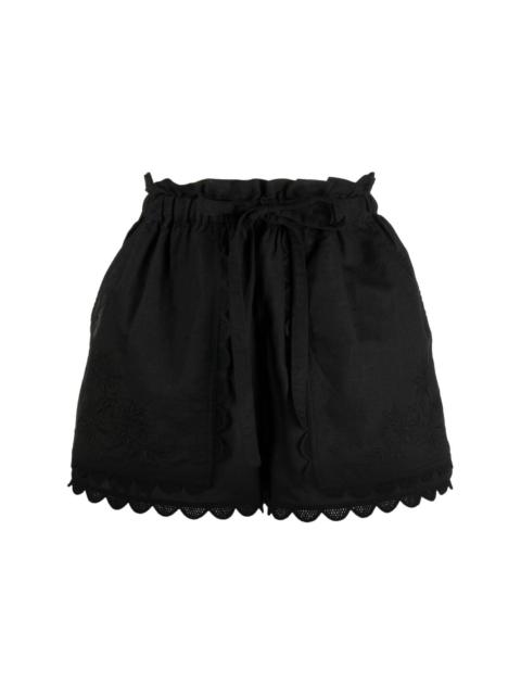 Nellie embroidered shorts Highlights - Ivory white - Cotton-linen blend - Embroidered design - Layered design - Ruched detailing - Scallop edge - Thigh-length - Two side inset pockets - Elasticated drawstring waistband Imported Composition Linen/Flax 60%, Cotton 40% SIZE & FIT Model measurements Height 5 ft 11 in(1.8 m) Bust/Chest 33.07 in(84 cm) Hips 37.4 in(95 cm) Waist 25.19 in(64 cm) FittingInformation Designed for a loose fit, offering comfort and movement when worn Adjust this piece’s waistband to your preference using the drawstring Made from a midweight non-stretch fabric This piece fits true to size – take your usual size