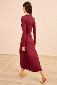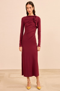 Made from organic cotton jersey, the Safi Dress is an effortless style that drapes gracefully and is artfully detailed with ruffles along the shoulder. The mahogany red complements golden accessories. - Organic cotton jersey - Model Height: 5'10" - Designed to be fitted at bust and waist, gently flared at skirt - Long sleeves - Concealed back zipper - Composition: 100% organic cotton - Gentle machine wash