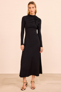 Made from organic cotton jersey, the Safi Dress is an effortless style that drapes gracefully and is artfully detailed with ruffles along the shoulder. The perennial noir lends enduring elegance. - Organic cotton jersey - Model Height: 5'10" - Designed to be fitted at bust and waist, gently flared at skirt - Midi length - Long sleeves - Concealed back zipper - Composition: 100% organic cotton - Gentle machine wash