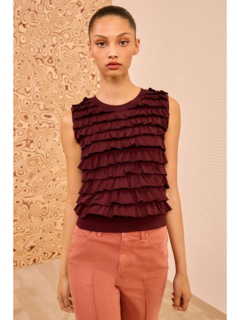 The Samira Pullover features solid and spaced-dyed yarns knitted into a vibrant palette of psychadelic stripes. This multiclored knit has a slim fit that transforms into a subtle peplum hem. - Knitted cotton - Model Height: 5'11" - Designed for slim fit - Crew neckline - Short sleeves - Peplum hem - Pullover style - Composition: 100% cotton - Dry clean only