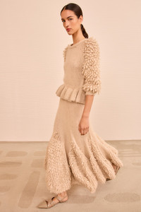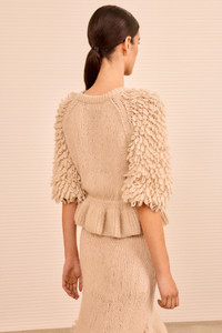Alive in surface texture, the Selene Pullover is hand-knitted from softest alpaca with looped detailing by our artisan partners in Peru. Arriving in alabaster white, this top features elegantly voluminous sleeves contrasted by a relaxed bodice with a peplum hemline. - Hand-knitted alpaca - Model Height: 5'10" - Designed for a relaxed fit - Crew neckline - Pullover style - Composition: 70% baby alpaca, 23% polyamide, 7% wool - Dry clean only