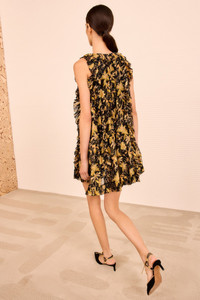 The Signe Dress flutters in form, crafted of lightweight chiffon adorned with metallic dots, florals, and pleated ruffles. This multicolored dress has a babydoll silhouette with an elegant, voluminous fit. - Metallic fil coupe chiffon - Model Height: 5'10" - Designed for a voluminous fit - Mini length - Round neckline - Sleeveless - Lined - Button keyhole at back - Composition: 91% silk, 9% metalized polyester - Dry clean only