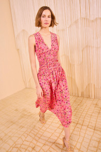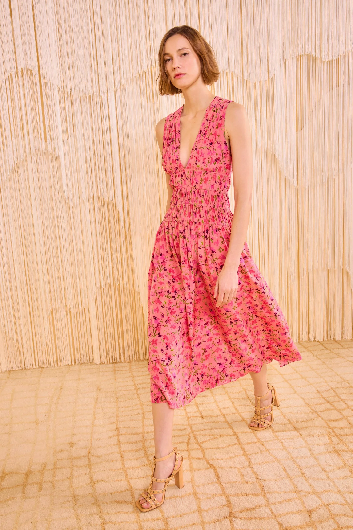 Perfect for sunlit soirees, the Sylvie Dress is crafted from pink crepe de chine that’s scattered with dynamic blooms in painterly gestures. Featuring a deep V-neckline, this sleeveless midi dress embraces the form, with gathering that flatters the waist before releasing into gentle volume. It fastens with a concealed side zipper. Designed with a fitted bust, fixed waist, and flares at the hem. Composition: 100% Silk Size & Fit - Model Height: 5'10"