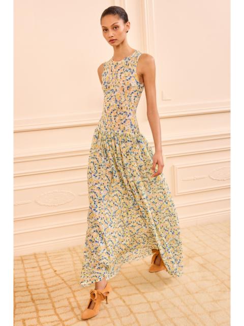 Debuting in Look 2 on the SS26 Runway, the Silvia Dress is a richly textured knit with dimensional stripes in yellow and cream. This occasion-ready dress is traced with gestural fringe at the sleeves and skirt that creates graceful movement with every step. - Textured stripe knit - Model Height: 5'10" - Designed for a slim fit at the bodice, loose at the skirt - Maxi length - Crew neckline - Sleeveless - Pullover style - Composition: 65% acrylic, 35% nylon - Dry clean only - Style# SP260731