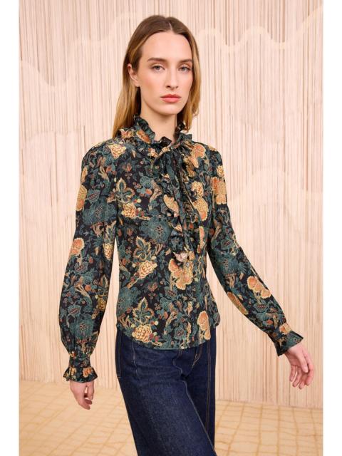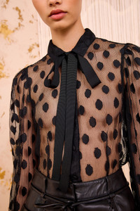 Look 6 on the AW25 runway showcases the Soraya Blouse, an ethereal black top in our gossamer lace dot, a delicate cotton-blend with effortlessly playful polka dots. This sheer top gently billows at the sleeves and has a ribbon necktie for a vintage touch. - Dotted cotton-blend lace - Model Height: 5'11" - Designed to be fitted at the bodice - Take the next size up to achieve a looser fit - Removable necktie - Long sleeves with button cuffs - Buttons through front - Composition: 60% polyamide, 40% cotton - Hand wash or dry clean