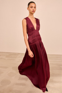 Refined in claret red, the Tasneem Gown is an occasion-ready dress crafted from signature plisse satin that moves with organic fluidity. The silhouette is pleated throughout with softly structured gathering that embraces the form. - Plisse satin - Model Height: 5'10" - Designed to be fitted under the bust and at the waist - Sleeveless gown - Drawstring shoulder ties - V-neckline - Concealed side zipper - Composition: 100% polyester - Dry clean only
