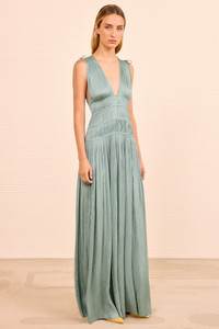 Refined in delicate green, the Tasneem Gown is an occasion-ready dress crafted from signature plisse satin that moves with organic fluidity. The silhouette is pleated throughout with softly structured gathering that embraces the form. - Plisse satin - Model Height: 5'10" - Designed to be fitted under the bust and at the waist - Sleeveless gown - Drawstring shoulder ties - V-neckline - Concealed side zipper - Composition: 100% polyester - Dry clean only