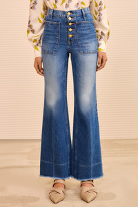 An Ulla Johnson signature, the Lou Jean is redefined in richly whiskered and faded blue denim with frayed cuffs for a lived-in feel. This elevated essential is defined by oversized patch pockets, exposed buttons, and gives way to a vintage-inspired flared hem. - Non-stretch denim - Handcrafted in Los Angeles - Model Height: 5'10" - High-rise, kick flare - Four-pocket construction - Inseam: 31 - Signature monogram leather patch and hand-hammered ring - Buttons along front - Composition: 80% cotton, 20% pre-consumer recycled cotton - Machine wash cold