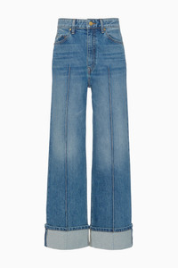 The Genevieve Jean is an Ulla Johnson signature reimagined with a hint of stretch. Crafted from Danube blue denim with soft fading, this slightly wide-leg style is accented with seams down the center front and exaggerated folded cuffs for an elevated essential. - Stretch denim - Handcrafted in Los Angeles - Model Height: 5'10" - High-rise, wide leg - Five-pocket construction - Inseam (cuffed): 33 - Signature monogram leather patch and hand-hammered ring - Front button and concealed zipper - Composition: 99% cotton, 1% elastane - Machine wash cold - Style# UJ9904072