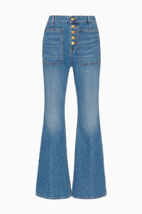 A forever-favorite silhouette, our Lou Jean is responsibly handcrafted in Los Angeles from non-stretch denim with oversized patch pockets and a vintage-inspired flared hem. This elevated essential arrives in our classic Danube wash that’s perfectly faded and whiskered, has a flattering high waist, and is finished with our signature antique brass buttons exposed at the center front. Composition: 100% Cotton These jeans run small. We suggest ordering this item one size larger than your usual size.