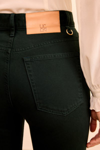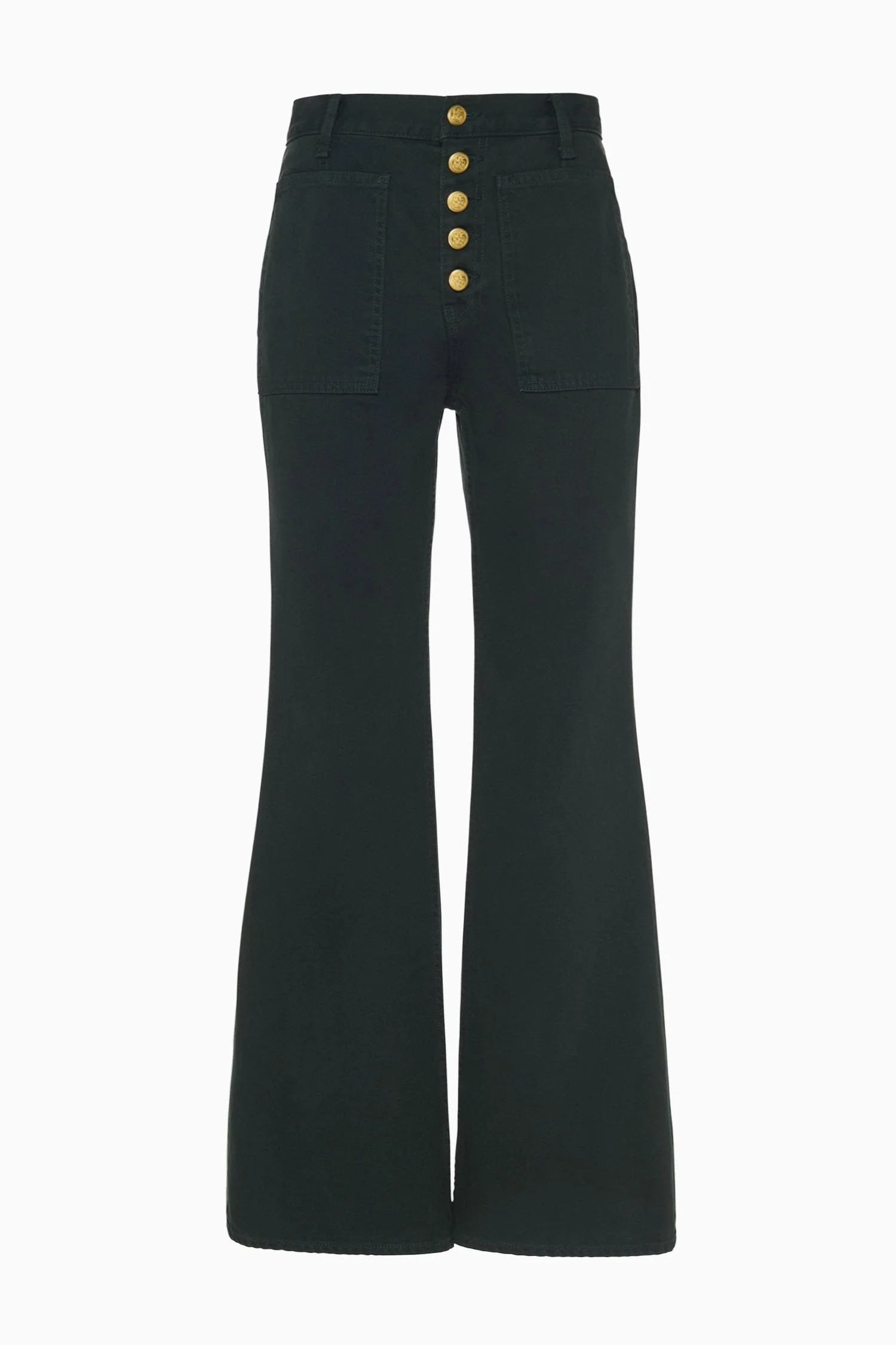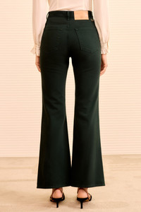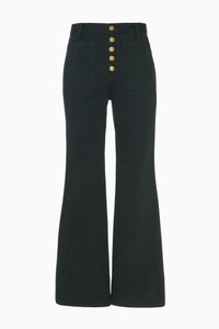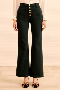 A forever-favorite silhouette, the Lou Jean is responsibly handcrafted from premium denim with oversized patch pockets, exposed buttons, and a vintage-inspired flared hem. It’s deeply saturated a lush Hunter green for an elevated yet versatile essential. - Non-stretch denim - Handcrafted in Los Angeles - Model Height: 5'11" - High-rise, bootcut - Four-pocket construction - Inseam: 31 - Signature monogram leather patch and hand-hammered ring - Buttons along front - Composition: 100% cotton - Machine wash cold