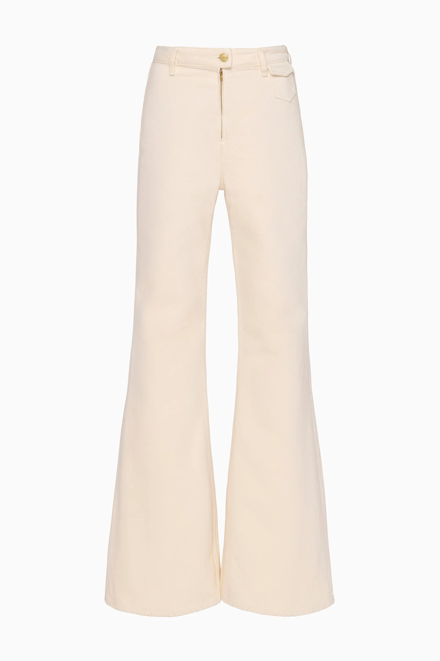 The Odelia Jean takes inspiration from the ’70s, designed with a high-rise waist and a coin pocket detail at the front. The Cowrie white shade is enduring and versatile, while the wide leg elongates the form. - Non-stretch denim - Handcrafted in Los Angeles - Model Height: 5'10" - High-rise, wide leg - Front zip coin pocket; back patch pockets - Signature monogram leather patch and hand-hammered ring - Front button and zipper - Composition: 100% cotton - Machine wash cold - Style# UJ9904080