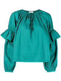 tie-front puff-sleeve blouse teal green cotton decorative stitching pleat detailing keyhole neck long puff sleeves straight hem Imported Composition Body: Cotton 100% SIZE & FIT Model measurements Height 5 ft 10 in(1.77 m) Bust/Chest 31.49 in(80 cm) Hips 35.43 in(90 cm) Waist 25.19 in(64 cm) FittingInformation This piece fits true to size. We recommend you get your regular size Cut for a loose fit Made with a mid-weight fabric