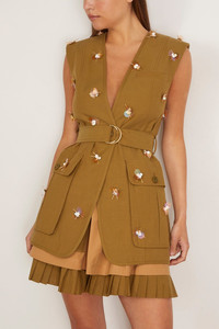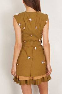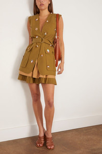 The Ulla Johnson Twyla Vest walked their Spring 25 Collection. This vest features hand woven embroidered with a tailored silhouette. Wear yours with the matching shorts and sandals. FIT DESCRIPTION MODEL MEASUREMENTS - Vest - Tailored silhouette - Long length - Hand embroidery - Self tie belt - 51% Cotton, 49% Tencel