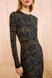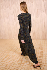 The Amari Dress is alive with an ikat-inspired animal print defined by earthy tones and shadowed textures. This multicolored dress is cut from signature jersey adorned for its softness and gracefully skims the form. - Tricot jersey - Model Height: 5'11" - Designed for a close fit, gently flares at hem - Maxi length - Long sleeves - Pullover style - Composition: 91% rayon, 9% elastane - Gentle machine wash