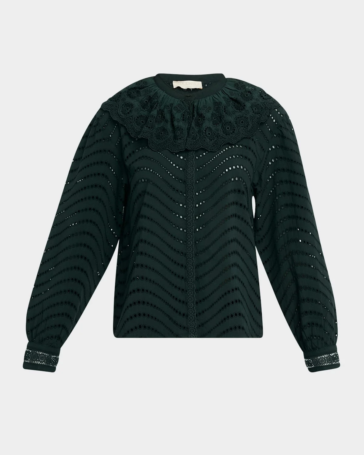 Adorned with statement scalloptrimmed ruffling at the collar, the "Fia" blouse by Ulla Johnson consists of mixed openwork embroidery throughout Crew neckline Long blouson sleeves; button cuffs Relaxed fit Hip length Cotton Machine wash cold Imported
