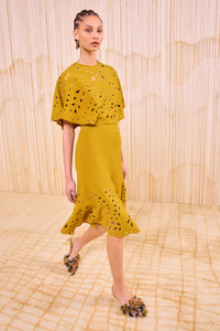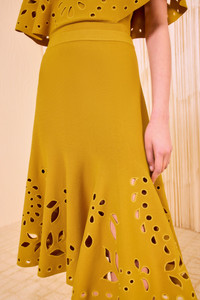 The Fiorella Skirt is inspired by a vintage Italian lace, alive at the hemline with petal-shaped embroidered eyelets. A rich golden shade, this compact knit skirt is a timeless A-line shape with an elastic waistband for effortless wear. This midi style beautifully coordinates with the matching Josie Top. Composition: 83% Viscose, 17% Polyester Pair it with our Josie Cape Sleeve Knit Top to complete the look. Size & Fit - Model Height: 5'9"