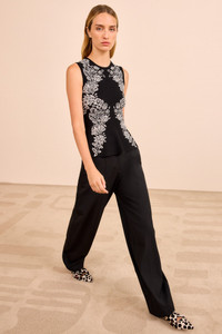 Artfully knitted from stretch jacquard, the Vanna Tank features vine motifs richly spun in graphic symmetry. This black and white top is softly structured with a peplum hem for timeless refinement. - Jacquard knit - Model Height: 5'11" - Designed for a slim fit - Crew neckline - Sleeveless - Peplum hemline - Pullover style - Composition: 83% viscose, 17% polyester - Dry clean only