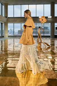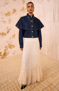 Look 6 on the AW25 runway showcases the Vera Skirt, an ethereal white style in flowing gossamer lace with effortlessly playful polka dots. Designed to sit high on the waist, this skirt has delicate gathers that release to fluid volume alive in gesture. - Dotted cotton-blend lace - Model Height: 5'10" - Maxi length, fixed high-rise waist - Silk lining - Concealed side zipper - Composition: 60% polyamide, 40% cotton - Hand wash or dry clean