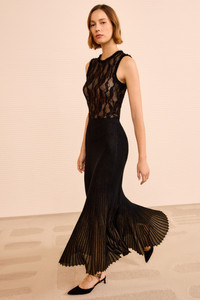 Designed with a pleated flared hem, the Vera Skirt lends poetic movement at every step. It is spun from signature sunburst knit in effortless black with lurex yarns that glimmer throughout. - Sunburst knit - Model Height: 5'11" - Midi length, elastic mid-rise waist - Slip-on style - Composition: 50% polyester, 50% viscose - Gentle machine wash
