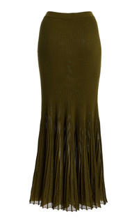 Hailing from eclectic Manhattan, Ulla Johnson - the daughter of archaeologists -travelled the world throughout her childhood, absorbing the colors, flavors and textures of ancient cultures surrounding her. Her eponymous brand effortlessly channels this unique upbringing by balancing modern silhouettes with vivacious patterns and hues. This elevated knit has a mostly ribbed texture which converts to semi-sheer pleats from the knee down. ‘Vera’ has a close fit and an elasticated waistband so it can be worn on the waist or lower towards the hip. Pair this piece with the coordinating knit top. PRODUCT DETAILS - Resort ‘26 - Slip on - Composition: 72% viscose, 28% polyester - Dry clean - Designer color: Olive - Imported