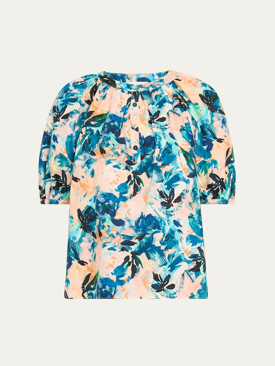 Ulla Johnson "Vienne" cotton blouse featuring a vibrant floral print Crew neckline; buttonplacket Short puff sleeves Classic fit Hem falls to the hip Pullover style Cotton Machine wash cold Imported