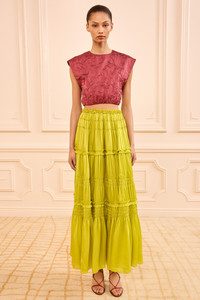 The Virginie Skirt is tailored from gossamer, crinkled chiffon in an uplifting Chartreuse green. Alive in motion, this midi skirt is designed with softly ruched tiers and petite ruffles that create a playful, flowing hemline. - Satin-faced silk chiffon - Model Height: 5'10" - Midi length, elastic waist - Slip-on style - Composition: 100% silk - Dry clean only - Style# SP260335