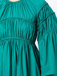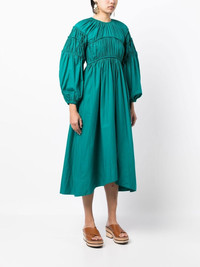 Viviana smocked dress teal green cotton smocking details round neck exposed rear zip fastening long puff sleeves calf-length Imported Composition Body: Cotton 100% SIZE & FIT Model measurements Height 5 ft 10 in(1.77 m) Bust/Chest 31.49 in(80 cm) Hips 35.43 in(90 cm) Waist 25.19 in(64 cm) FittingInformation This piece fits true to size. We recommend you get your regular size Cut for a loose fit Made with a mid-weight non-stretch fabric