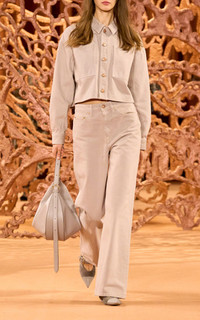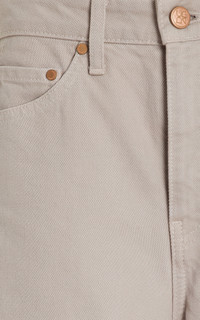 PRODUCT DETAILS - Relaxed fit, mid-rise, straight-leg silhouette, fly-front, belt loops, side pockets, back pockets - Unlined - Composition: 100% Cotton - Color: light grey - Button and concealed zip fastening along front - Made in United States of America