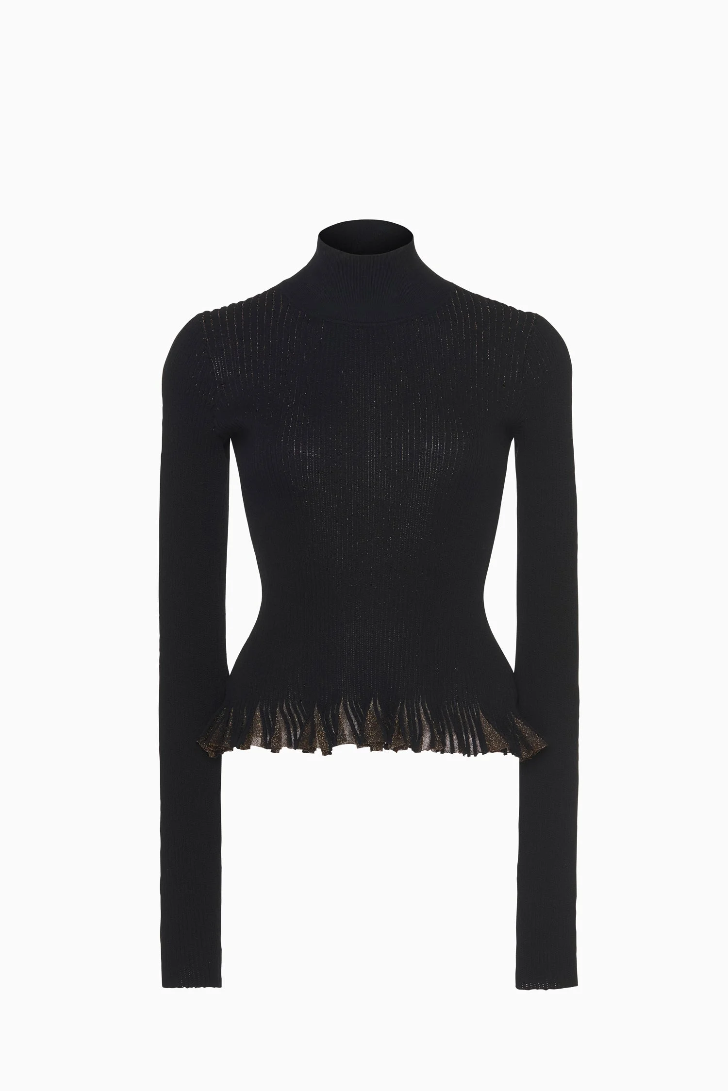 The Yulia Top is an elevated, cold-weather essential spun from signature sunburst knit with black and shimmering lurex yarns. The slim fit is ideal for layering, while the ruffled hemline adds playful dimension. - Sunburst knit - Model Height: 5'10" - Designed for a slim fit - Turtleneck - Long sleeves - Pullover style - Composition: 60% viscose, 40% polyester - Gentle machine wash