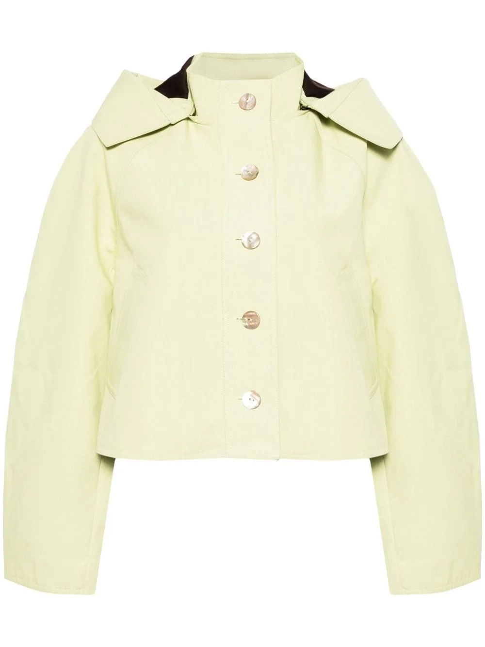hooded cropped jacket Highlights - Lime green - Cotton - Classic hood - High neck - Front button fastening - Two diagonal pockets to the sides - Long sleeves - Straight hem Made in United States Composition Back: Cotton 100%, Polyester 35% Front: Cotton 100% Lining: Polyester 100% SIZE & FIT Model measurements Height 5 ft 9 in(1.76 m) Bust/Chest 31.1 in(79 cm) Hips 35.03 in(89 cm) Waist 24.4 in(62 cm) FittingInformation Designed to be unstructured, offering a loose fit throughout Cropped in length Made from a midweight non-stretch fabric This piece fits true to size – take your usual size