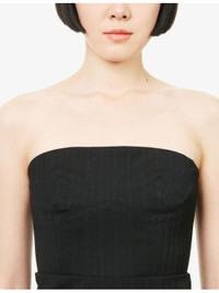 PRODUCT DETAILS - Uma Wang stretch-wool blend midi dress - 69% virgin wool, 28% viscose, 2% elastane, 1% cotton - Exposed button fastening and concealed hook-and-eye fastening at front - Regular fit, curved neckline, strapless, corset boning, high-waist, all-over striped print, split at back - Hand wash cold - Made in Italy - True to size - Size small: length 44in / 113cm - Model is 5ft 10in/1.78m and wears a size small - Lightweight, stretchy Ref: R04507935