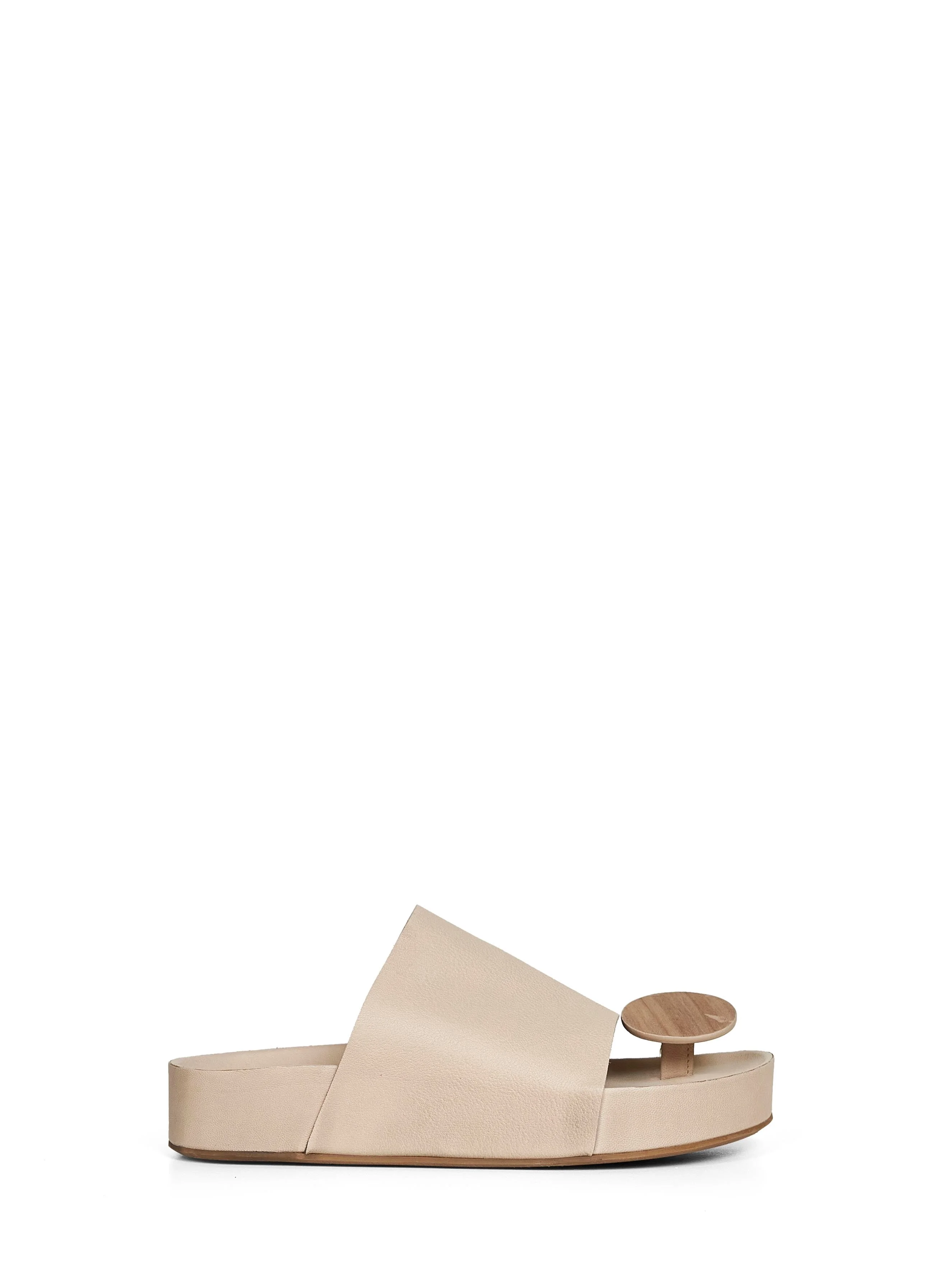 - Slip-on - Wide natural grain leather band; thong strap with wood-effect round detail - Molded leather insole - Leather lining - Flatform sole - Sole height: 35mm - The shoe corresponds to a it 38 size - Beige color - 100% bovine leather - Made in italy Furs & Skins: Bovine Leather (top grain)100 % Made in: Italy Season: P26 US9075-UW102