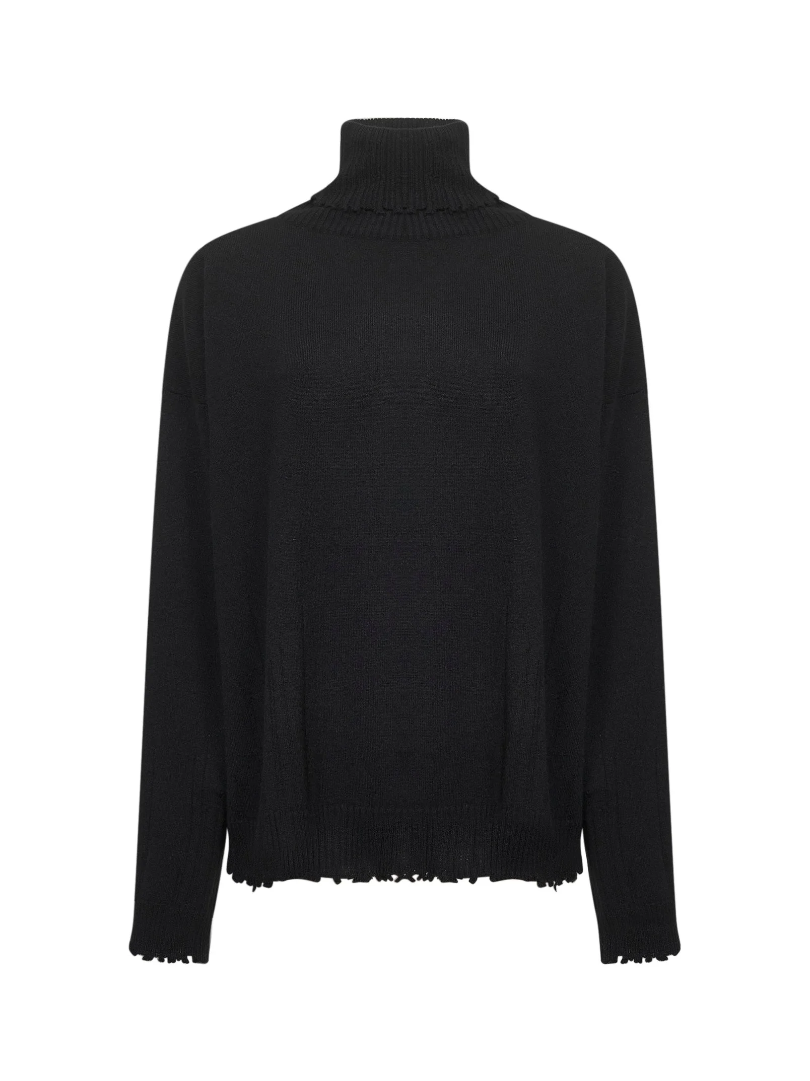 - Ribbed turtleneck collar - Long sleeves, cut-out detail at right shoulder, dropped shoulders - Ribbed cuffs and bottom band - Distressed-effect finishes at collar, cuffs and bottom band - Relaxed fit - Black color - 100% cashmere - Made in italy Wool or fine animal hair: Cashmere100 % Made in: ITALIA Season: A25 UK7134-UW900