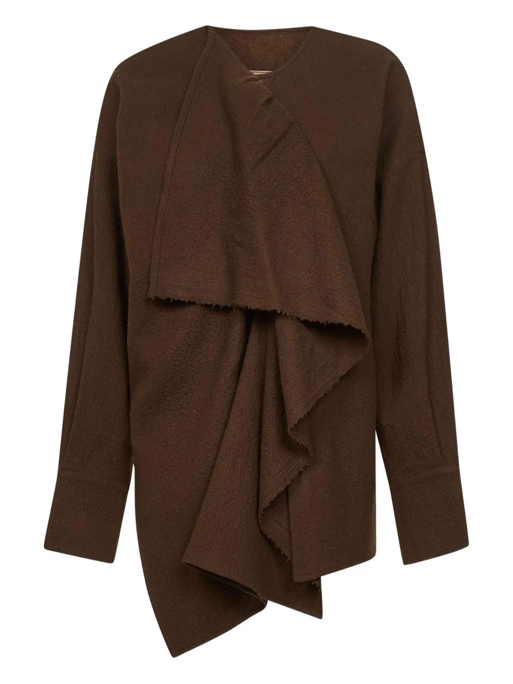 asymmetric-ruffle wool top Highlights - Brown - Asymmetric neckline - Long sleeves - Dropped shoulders - Two button cuffs Made in Italy Composition Virgin Wool 100% Washing instructions Read Manufacturer Guidelines