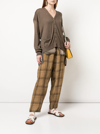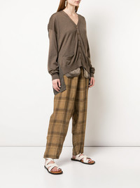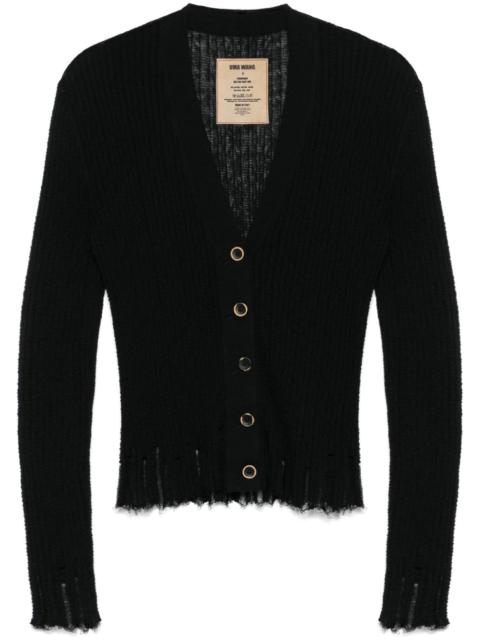 buttoned fine knit cardigan Dark brown wool blend buttoned fine knit cardigan from Uma Wang featuring ribbed details, a deep V neck, long sleeves, fitted cuffs, front pockets and a straight hem. Made in Italy Composition Silk 35%, Wool 35%, Cashmere 30% SIZE & FIT Model measurements Height 5 ft 10 in(1.77 m) Bust/Chest 31.88 in(81 cm) Hips 33.85 in(86 cm) Waist 24.01 in(61 cm) Washing instructions Dry Clean Only