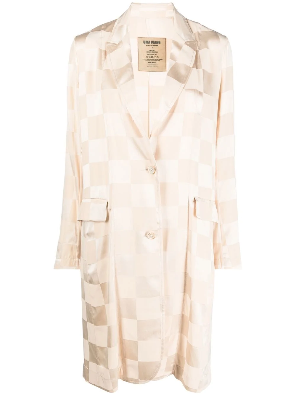 checkerboard-print shirt jacket Uma Wang presents this longline jacket from the label's AW22 collection. This design is decorated with an all-over checkerboard pattern in a beige and white colourway, whilst the silk construction creates a lightweight piece. Made in Italy Composition Silk 100% SIZE & FIT Model measurements Height 5 ft 9 in(1.76 m) Bust/Chest 31.88 in(81 cm) Hips 35.43 in(90 cm) Waist 24.8 in(63 cm) FittingInformation This piece fits true to size. We recommend you get your regular size Cut for a loose fit Made with a mid-weight non-stretch fabric Washing instructions Hand Wash