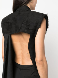 deconstructed backless double-breasted waistcoat Highlights - Black - Cotton-linen blend - Deconstructed design - Peak lapels - Double-breasted button fastening - Sleeveless - Backless - Frayed edge Made in Italy Composition Outer: Cotton 53%, Linen/Flax 47% Lining: Cupro 50%, Viscose 50% SIZE & FIT Model measurements Height 5 ft 11 in(1.8 m) Bust/Chest 33.07 in(84 cm) Hips 37.4 in(95 cm) Waist 25.19 in(64 cm) FittingInformation Designed to be unstructured, offering a loose fit throughout Made from a midweight non-stretch fabric This piece fits true to size – take your usual size