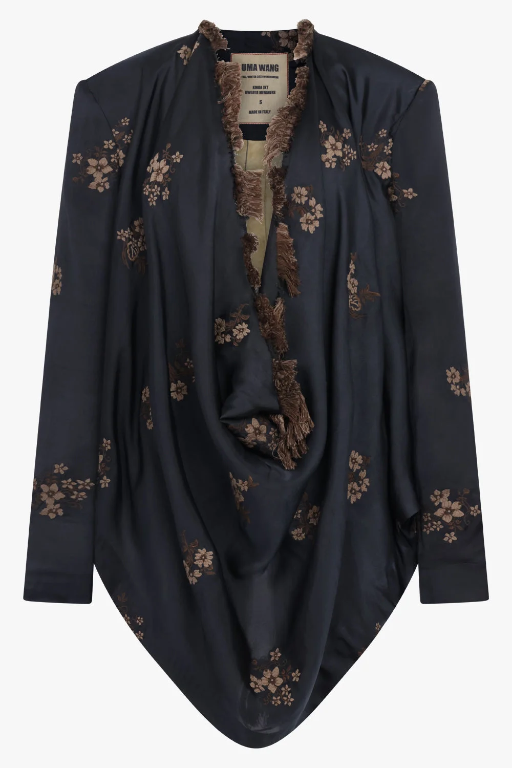 An expressive outerwear statement, the Kinoa Floral Embroid Jacket by Uma Wang blends artisanal detailing with fluid, sculptural design. The jacket features an oversized front drape that falls effortlessly across the body, creating a sense of movement and softness. Long, fluid sleeves and subtly padded shoulders provide gentle structure without rigidity, while intricate floral embroidery throughout adds depth and texture. Finished in a black base with rich brown floral motifs, the piece embodies refined craftsmanship with a poetic edge. - Fabrication: 52% cotton, 34% cupro, 14% viscose - Detailed floral embroidery throughout for artisanal texture - Oversized, exaggerated front drape for fluid movement - Long, fluid sleeves for relaxed elegance - Subtly padded shoulders for light structure without stiffness - Four-button cuffs for refined finishing detail - Black base colourway with brown floral embroidery Style it over tailored trousers or a fluid dress to highlight the jacket’s sculptural drape and intricate embroidery.