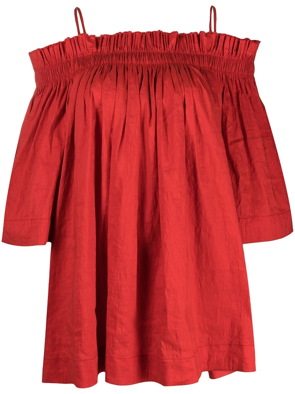 off-shoulder linen blouse apple red linen blend draped design off-shoulder elasticated band spaghetti straps half-length sleeves POSITIVELY CONSCIOUS: At least 50% of the main material of this product meets our conscious criteria. For example, it's either organic, recycled, upcycled or independently recognised as being better for the environment (such as linen, ramie, TENCEL™ etc.). Made in Italy Composition Linen/Flax 78%, Polyamide 17%, Spandex/Elastane 5% Washing instructions Hand Wash