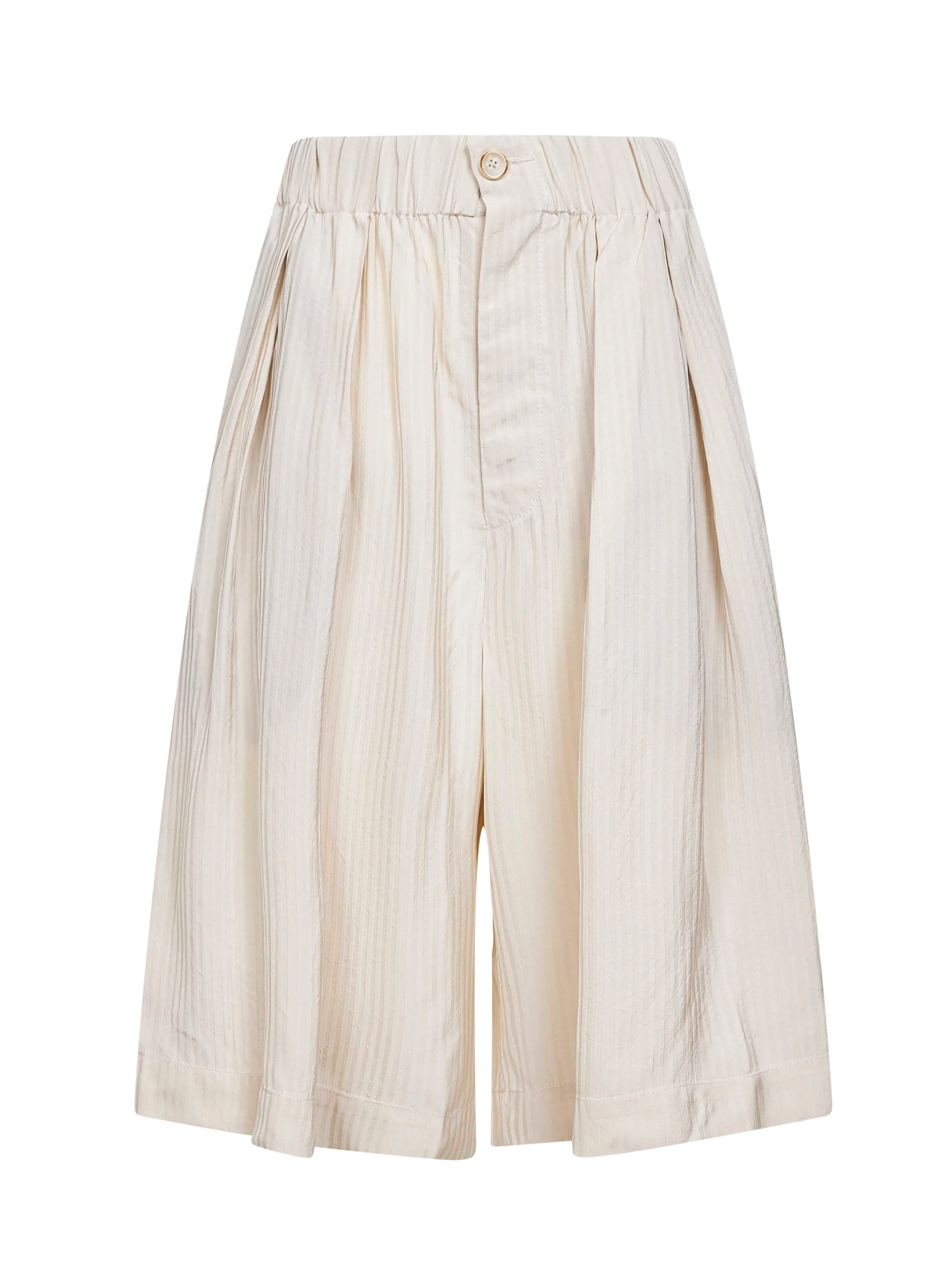 - Front zip-fly and button closure - Elasticated waistband; gathered detailing at waist - Side pockets, back buttoned welt pockets - Double front pleat - Wide leg - Tone-on-tone jacquard vertical striped pattern - Off-white color - 100% viscose - Made in italy Synthetic: viscose100 % Made in: Italy Season: P26 UW3014-UW101