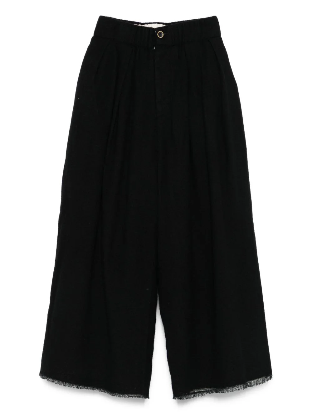 pleated frayed trousers Highlights - Black - Pleated front - Elasticated waistband - Frayed hem - Wide leg Made in Italy Composition Outer: Wool 54%, Linen/Flax 33%, Polyamide 13% Lining: Cotton 100% SIZE & FIT Model measurements Height 5 ft 11 in(1.8 m) Bust/Chest 32.67 in(83 cm) Hips 36.22 in(92 cm) Waist 24.4 in(62 cm) Washing instructions Hand Wash