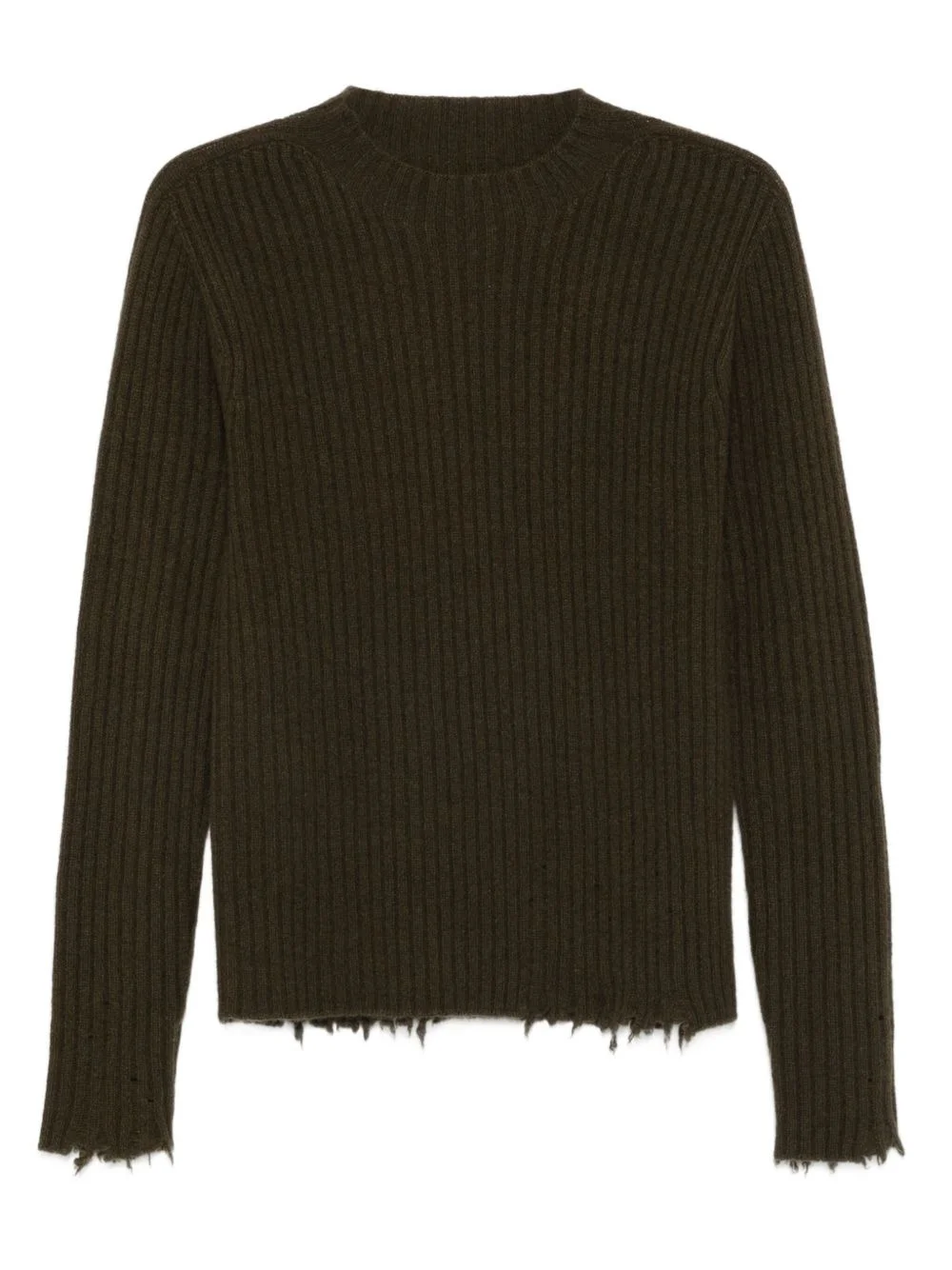 ribbed frayed-edge jumper Highlights - Army green - Ribbed knit - Frayed edges - Crew neck - Long sleeves - Straight hem Made in Italy Composition Cashmere 100% SIZE & FIT Model measurements Height 5 ft 9 in(1.75 m) Bust/Chest 34.64 in(88 cm) Hips 36.61 in(93 cm) Waist 26.37 in(67 cm) Washing instructions Hand Wash