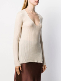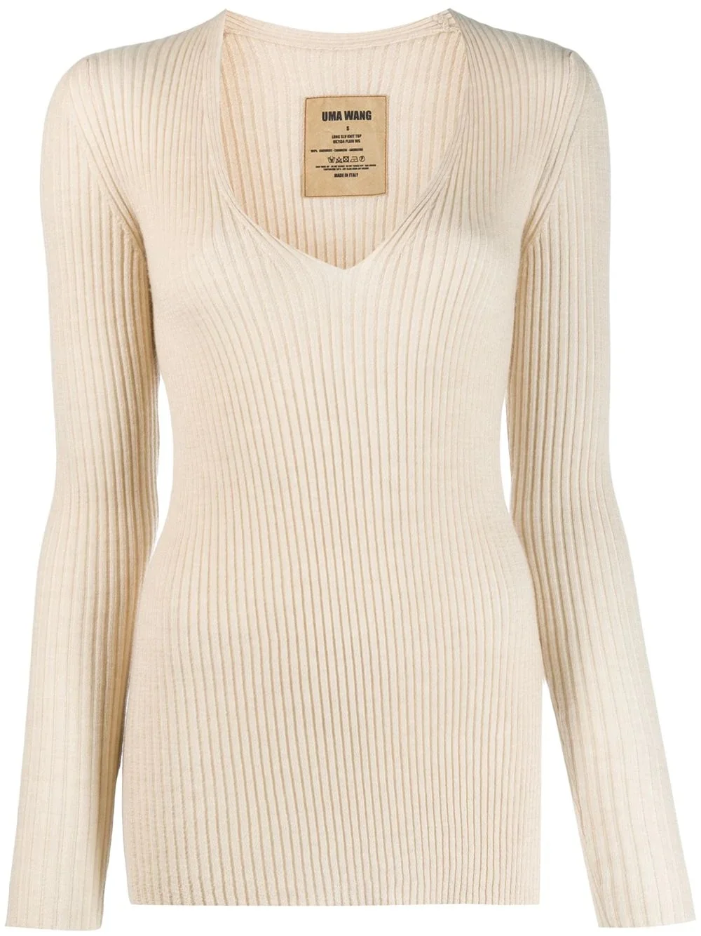 ribbed knitted jumper Cream cashmere knitted jumper from Uma Wang featuring a v-neck, long sleeves and a ribbed design. Made in Italy Composition Cashmere 100% SIZE & FIT Model measurements Height 5 ft 10 in(1.78 m) Bust/Chest 27.95 in(71 cm) Hips 35.82 in(91 cm) Waist 24.01 in(61 cm) FittingInformation This piece fits true to size. We recommend you get your regular size Cut for a slim fit Made with a mid-weight fabric Washing instructions Hand Wash
