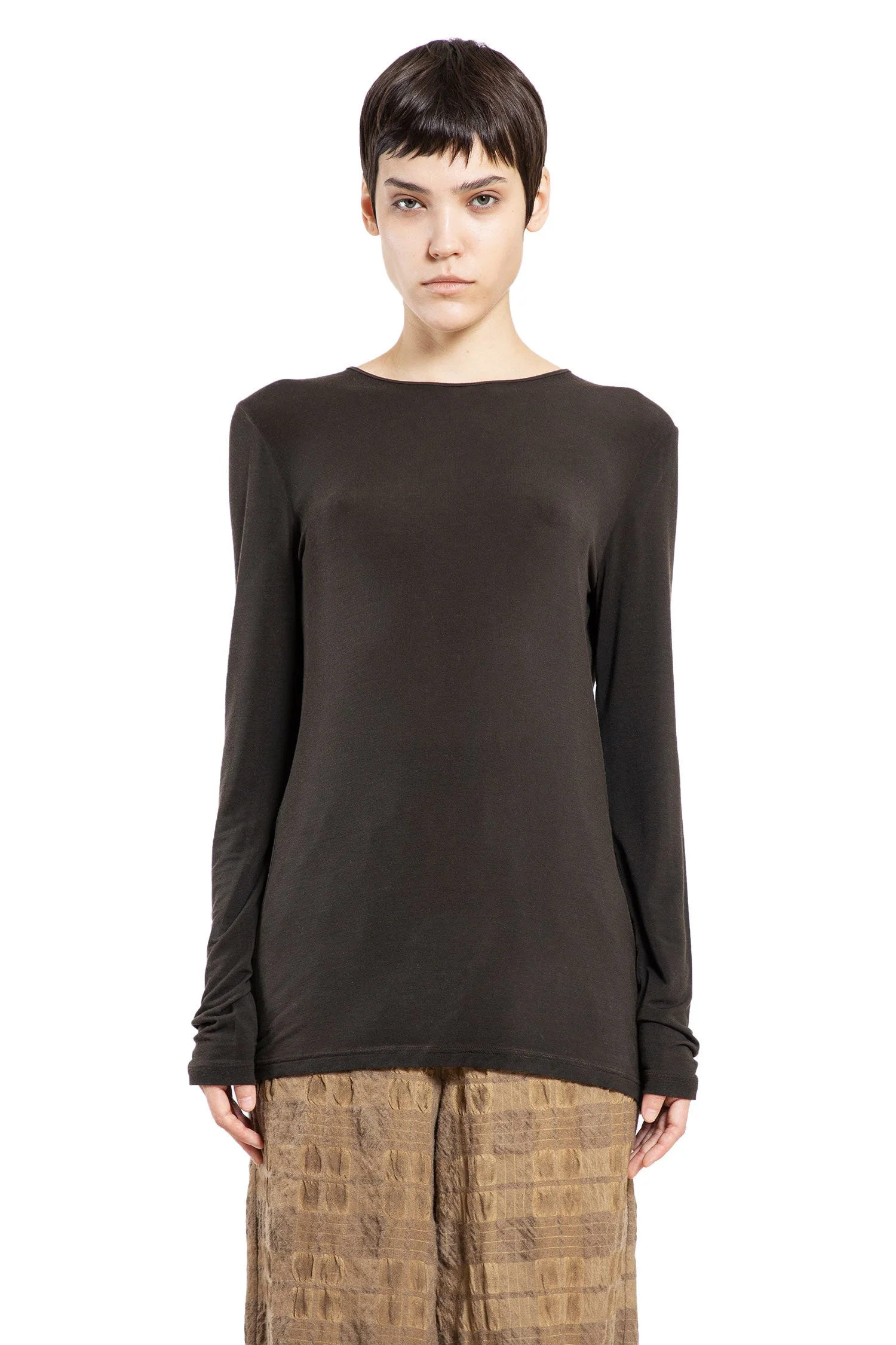 DESCRIPTION - Brown - Stretch lightweight modal jersey - Round neck - Dropped shoulders - Long sleeves - Back self-tie straps - Back signature stitching - Draped open back - Elongated hem DETAILS - Made in: Italy - Composition: 93% Modal 7% Elastane - Model code: UP1038 UW600 - Item ID: 9882353402198