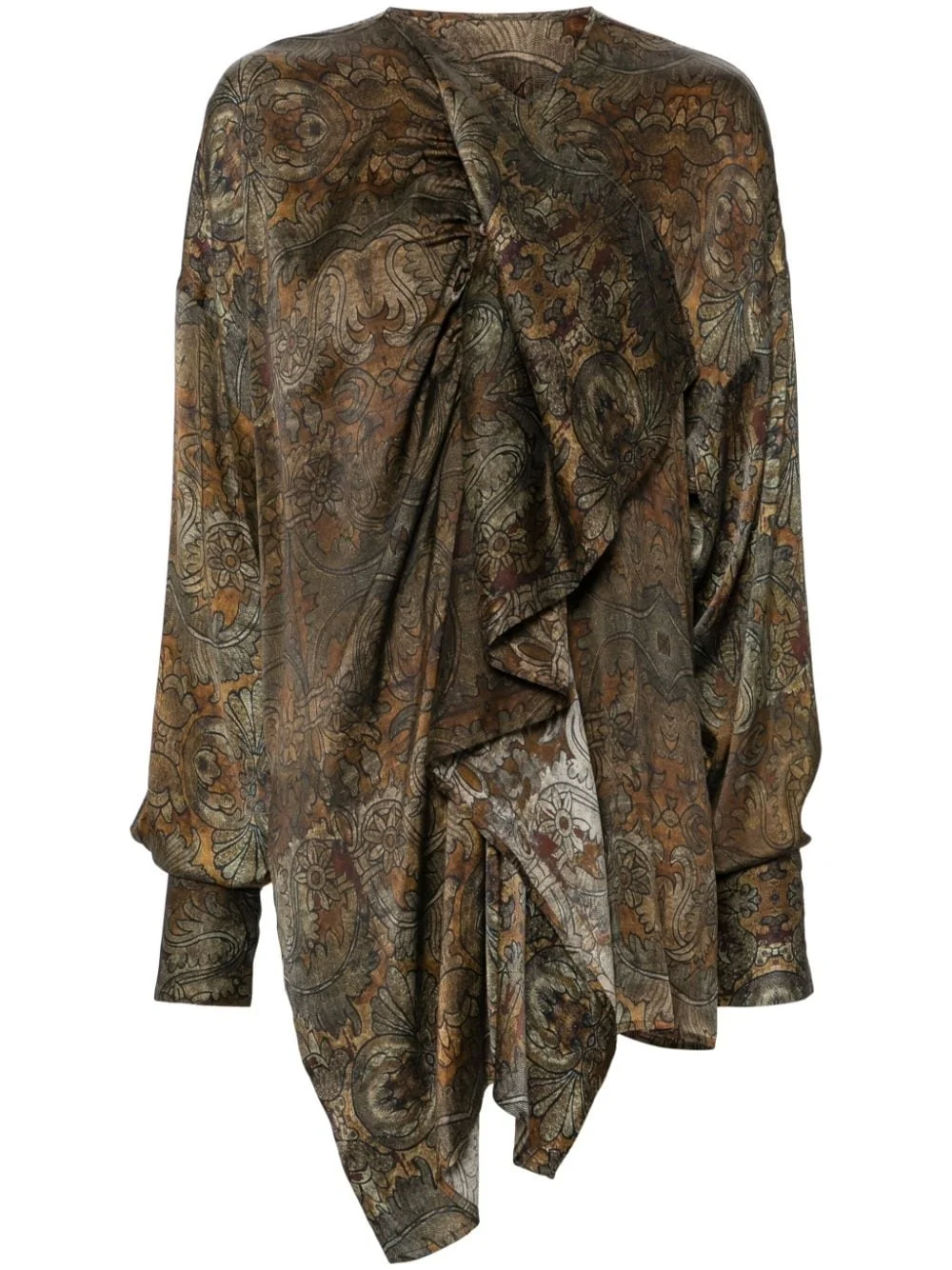 Tumble top Highlights - Rust brown - Stretch-silk - All-over graphic print - Draped detailing - Shirred effect - Crew neck - Long sleeves - Buttoned cuffs - Asymmetric hem Made in Italy Composition Body: Silk 94%, Elastane 6% SIZE & FIT Model measurements Height 5 ft 9 in(1.76 m) Bust/Chest 31.1 in(79 cm) Hips 35.03 in(89 cm) Waist 24.4 in(62 cm) FittingInformation Designed for a relaxed fit, this piece allows for comfort and movement when worn Made from a midweight stretch fabric, this piece offers elasticity and flexibility when worn