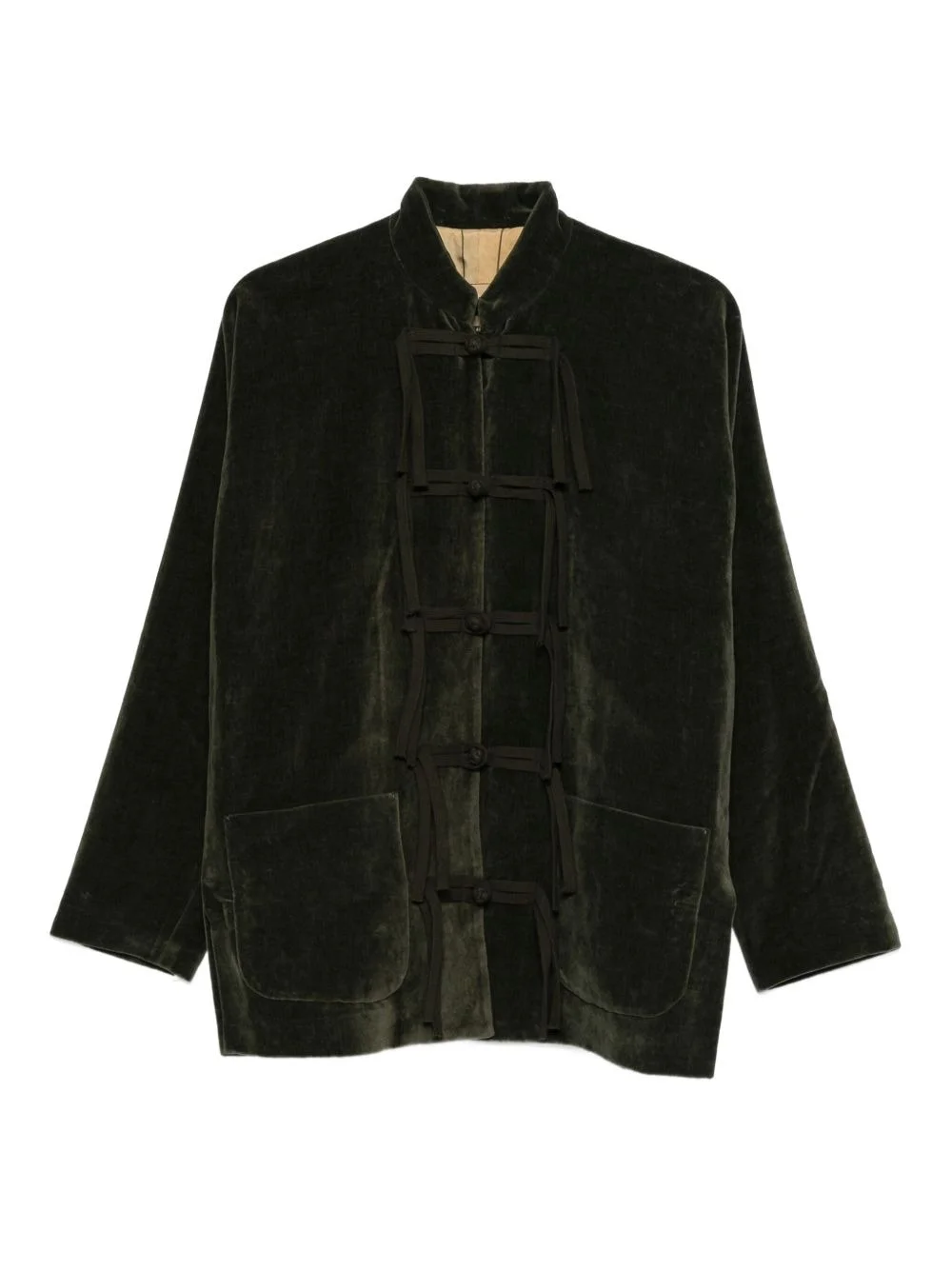 knotted velvet jacket Highlights - Green - Velvet texture - Knotted fastening - Long sleeves - Patch pockets Made in Italy Composition Lining: Viscose 50%, Cupro 50% Outer: Cotton 55%, Linen/Flax 45% SIZE & FIT Model measurements Height 5 ft 9 in(1.75 m) Bust/Chest 34.64 in(88 cm) Hips 36.61 in(93 cm) Waist 26.37 in(67 cm) Washing instructions Hand Wash