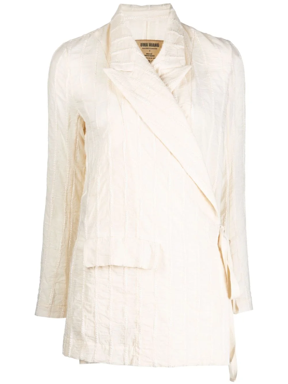 wraparound oversize blazer Highlights - Off-white - Cotton - Vertical stripe pattern - Wraparound style - V-neck - Notched lapels - Tied waist - Front flap pocket - Long sleeves - Buttoned cuffs - Straight hem Made in Italy Composition Cotton 100% Washing instructions Dry Clean Only